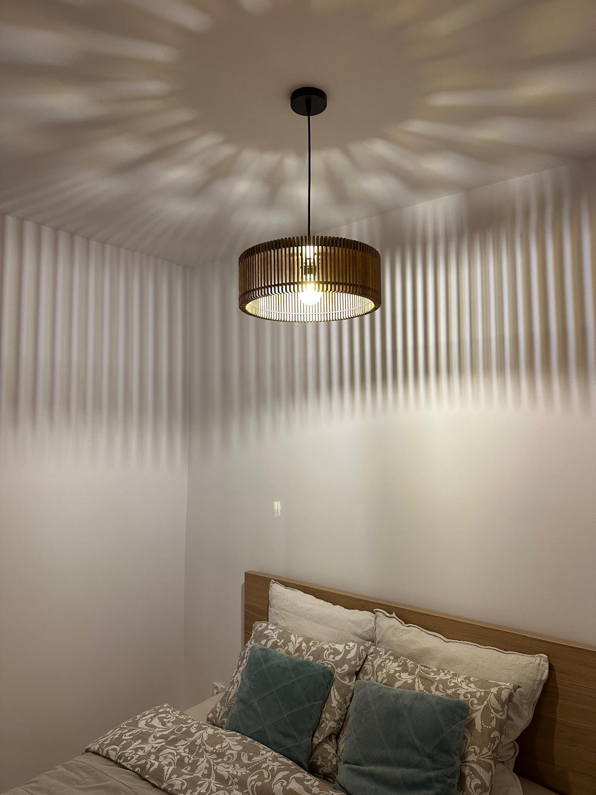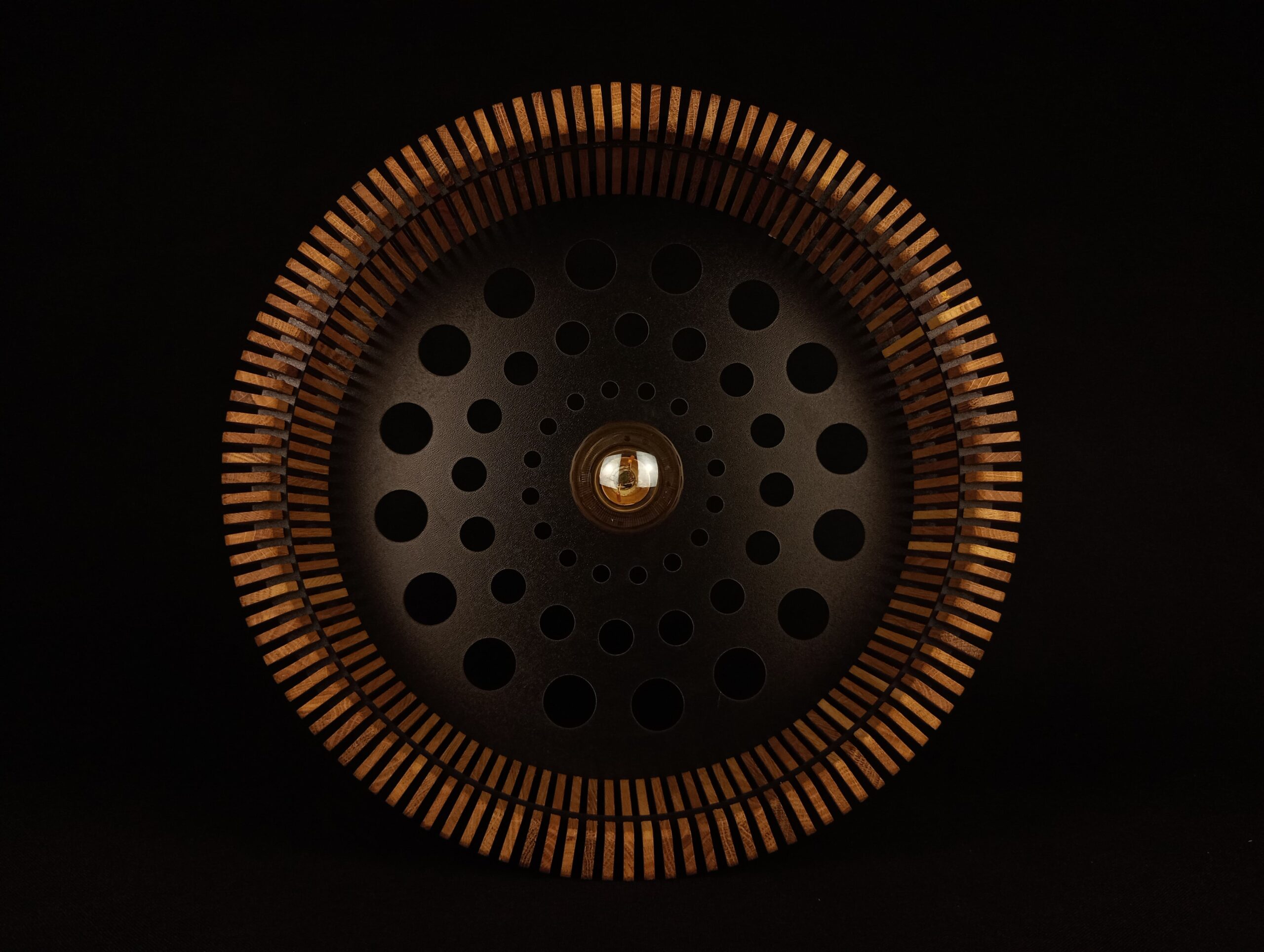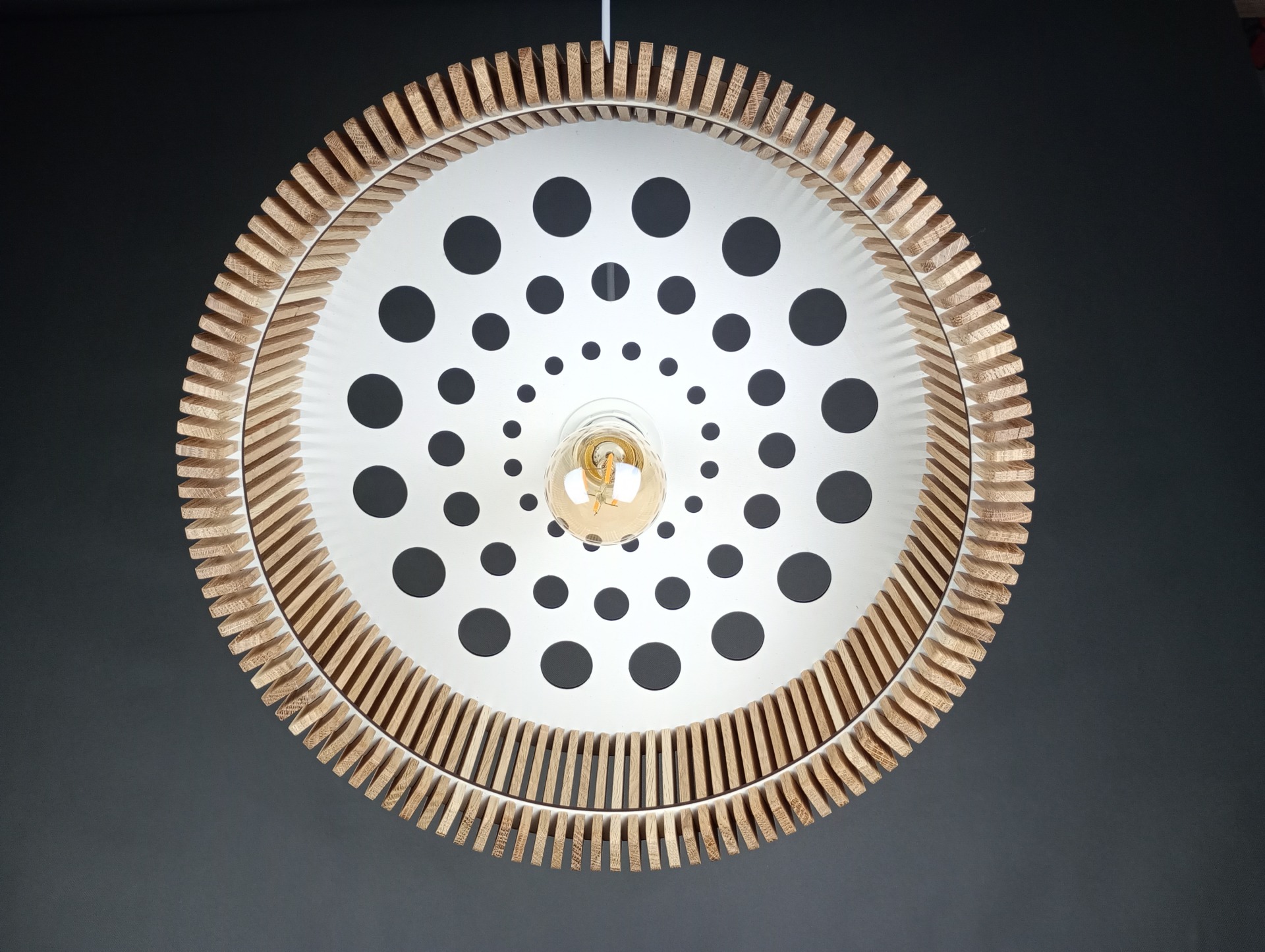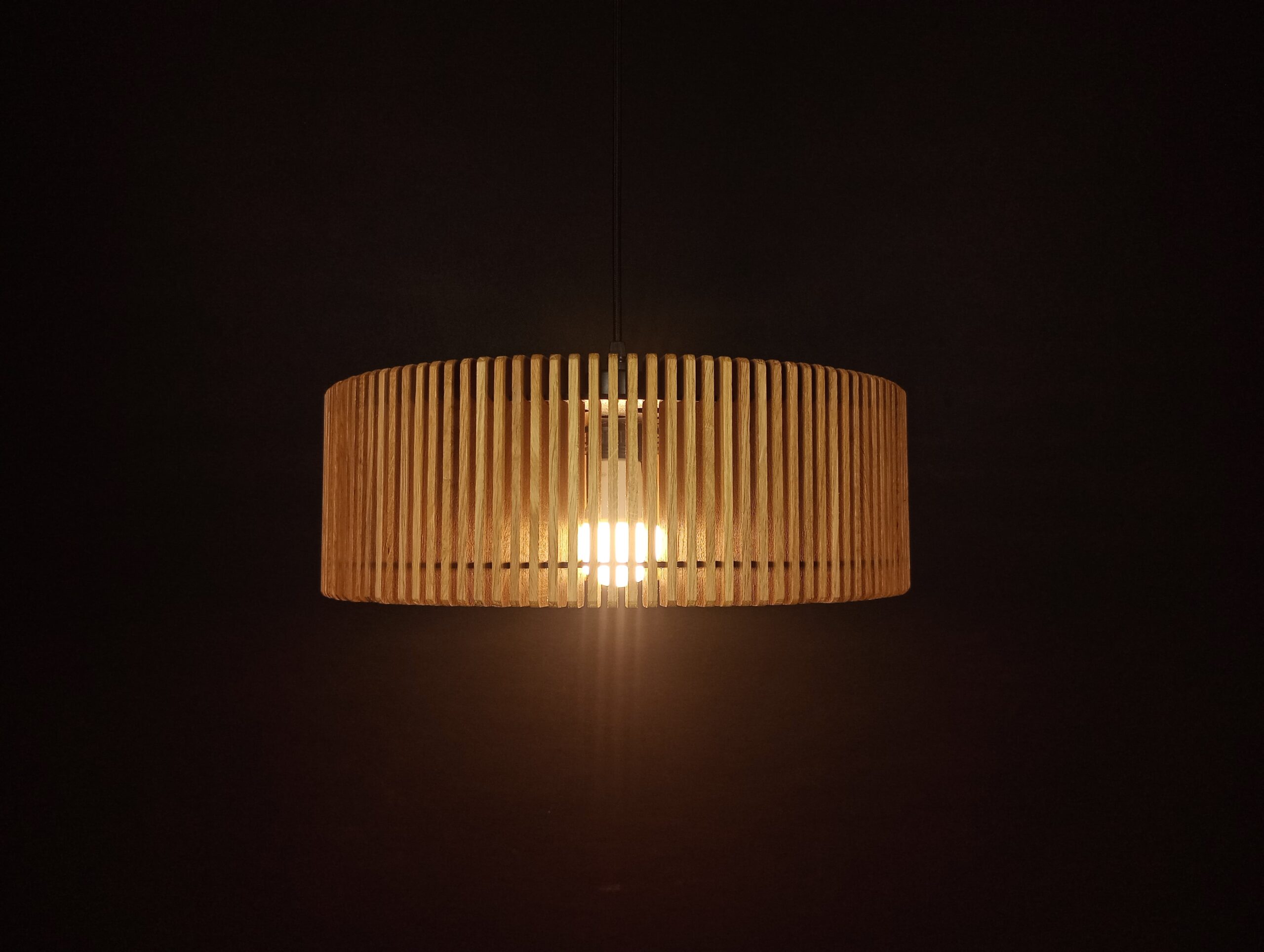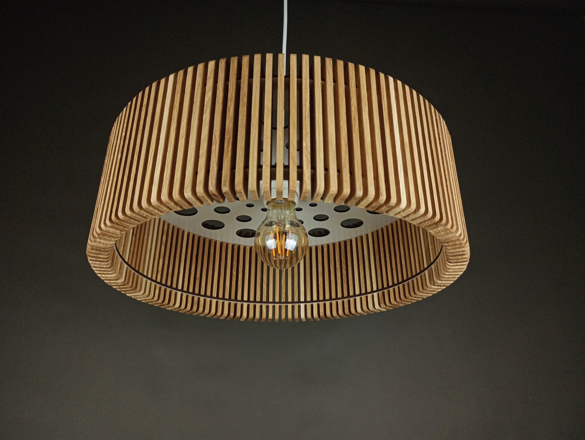Lampa Okrąg Duży, model LO1X38, wniesie do Twojego wnętrza niepowtarzalny urok. Naturalne drewno dębowe zapewnia ciepły charakter. Cylindryczny abażur ma średnicę 38 cm i wysokość 13 cm. Został misternie utkany ze 120 pionowych dębowych lameli. Te cienkie listewki tworzą ażurową konstrukcję. Filtrują światło nadając mu przytulny, miodowy odcień.