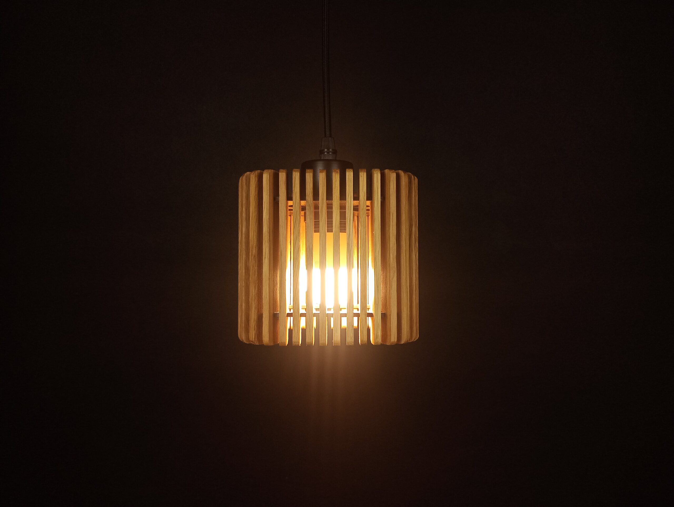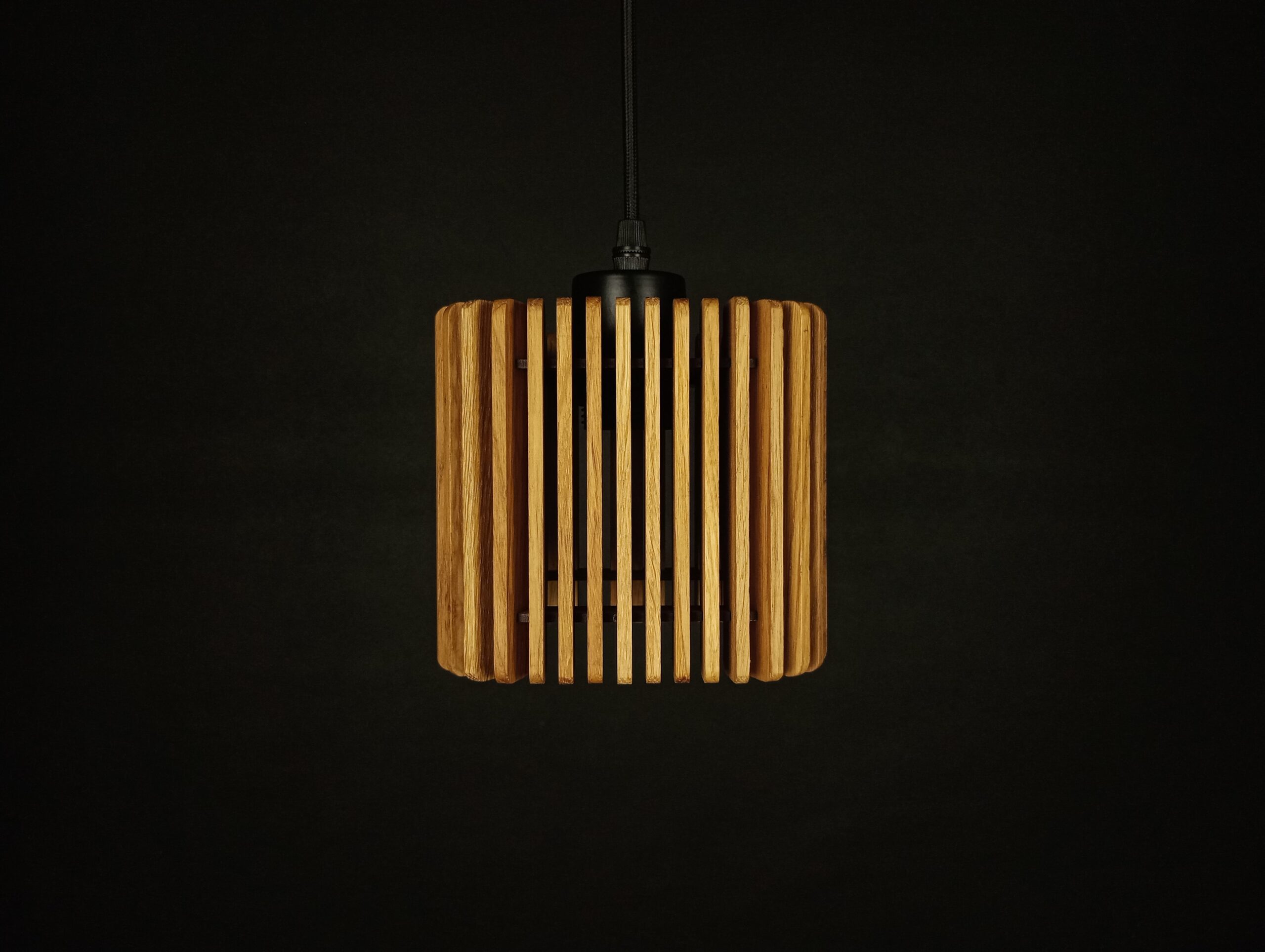 Solidny zwis pojedynczy stanowi podstawę lampy. Zakończyliśmy go metalowym deklem o średnicy 8 cm w eleganckim, matowym czarnym kolorze. Świetnie współgra z naturalnym odcieniem dębowego drewna. Regulowany kabel w oplocie ma długość 100 cm. Pozwala łatwo dostosować wysokość lampy do indywidualnych potrzeb.