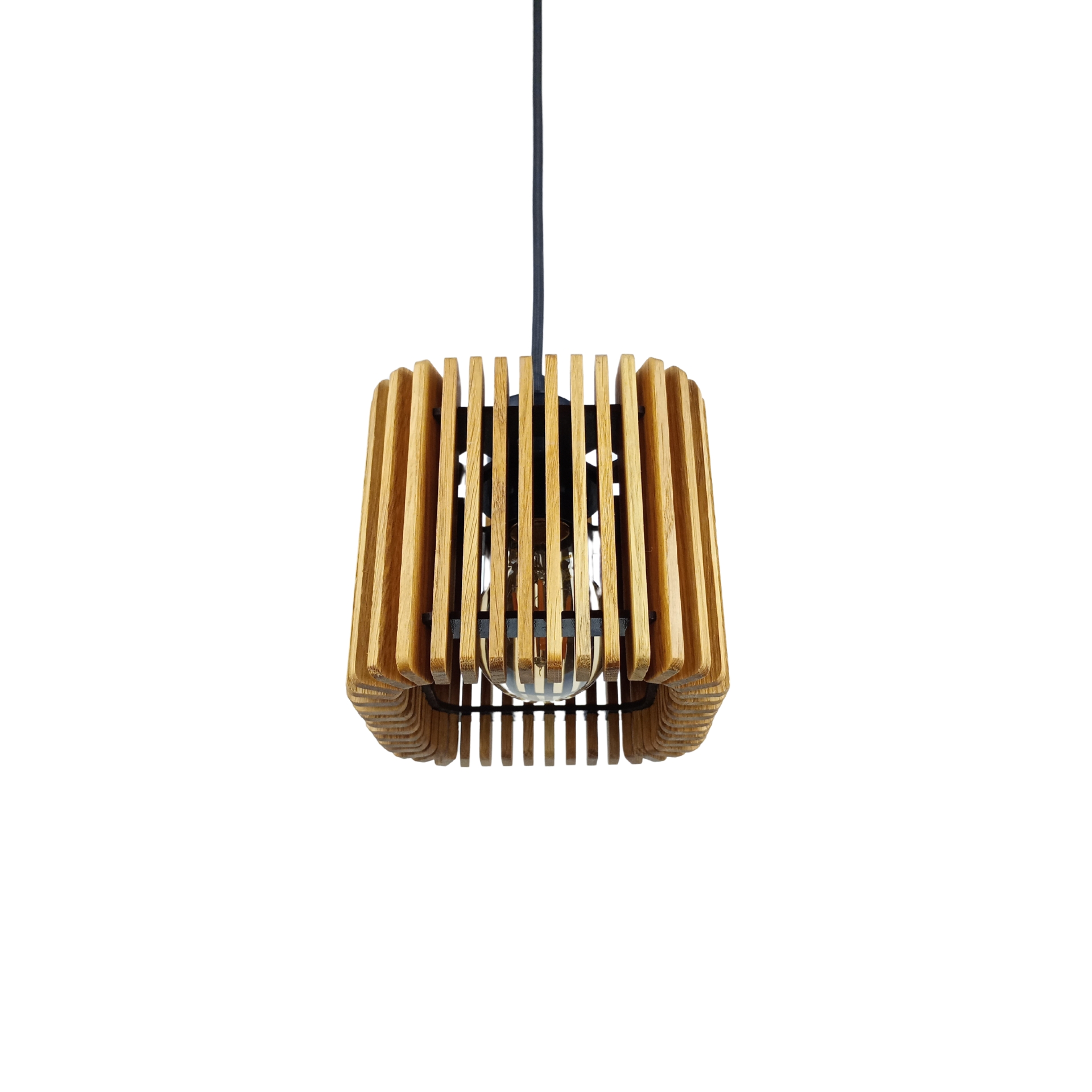 Lampa Kwadrat Mały, model LK1X14, pokazuje jak geometryczny minimalizm łączy się z ciepłym, przytulnym oświetleniem. Jej kompaktowy, kwadratowy abażur ma wymiary 14×14 cm i wysokość 13 cm. Wykonaliśmy go starannie z 46 precyzyjnie ułożonych dębowych lameli.